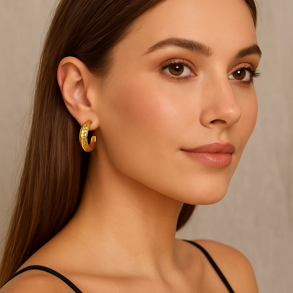 Ces boucles d'oreilles plaquées or pour femme présentent un design robuste avec une gravure géométrique classique, idéal pour celles qui recherchent une pièce avec du caractère et de la personnalité. La finition polie met en valeur le motif gravé avec précision, offrant un effet visuel saisissant sans être exagéré.